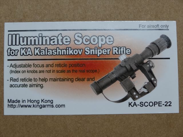 しかし、色々考えているとやっぱり専用のスコープが似合うなぁと思い、ネットで手頃な物がないか物色していました。何種類もありますが、割とリーズナブルな価格の物はレビューにそのままでは銃本体のレールにはまらないので、スコープのレール部分を削らなければならないと書かれています。それは面倒だし、スコープにキズが付くので、A&Kのドラグノフにポン付け出来る物がないかと探していたら、ありましたよ。King Armsの製品です。K