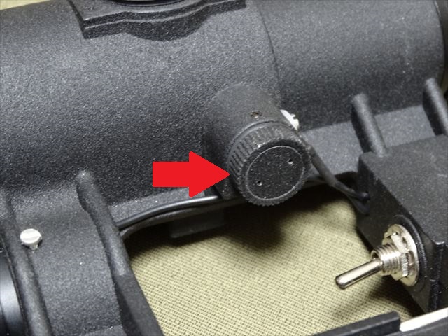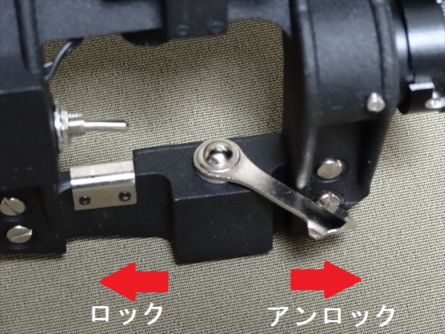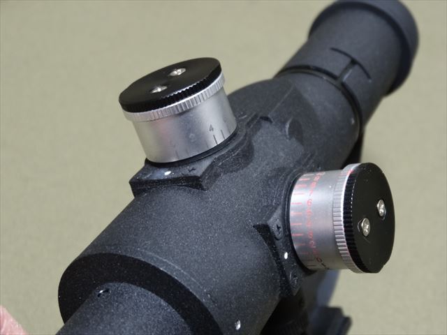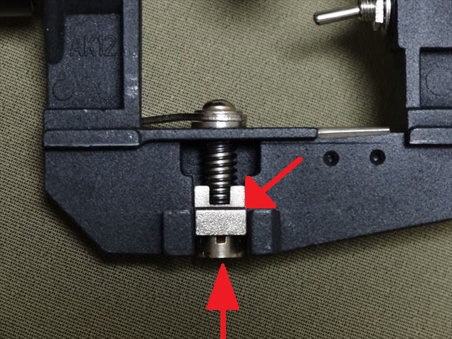 四角のコマがレールに押され付けられてスコープを固定します。従って固定した時にガタがある場合はコマの下のナットを回して調整します。ドライバーもいりません。手で回せます。少しずつ回してちょうど良いところを探します。