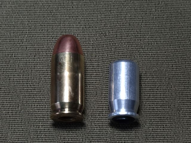 45ACPのダミーカートリッジと比較してみると全長、直径共に小さいですね。