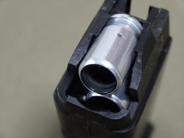 装弾数は6発です。実物は45ACPを13発装填できます。こちらは6発と少ないですが、一応ダブルカラムマガジンっぽくカートリッジが並んでいます。