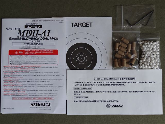 取扱説明書、ターゲット、カートリッジ、BB弾、六角レンチ、Ver2の変更点お知らせが同梱されています。変更点としてはカートリッジが金属からプラ製になったことと、LD2というホップアップシステムがなくなったことが書かれています。