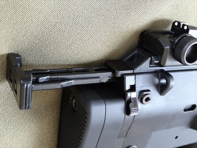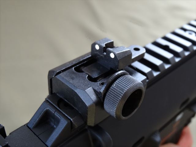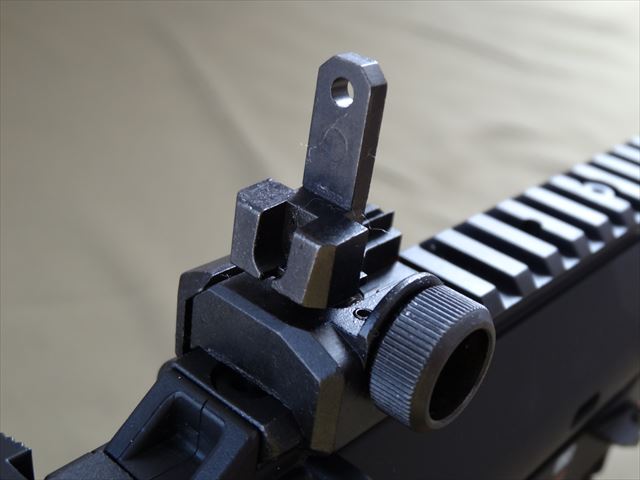 リアサイト。ピストルタイプで射撃する場合はこの状態で。左右に調整できます。