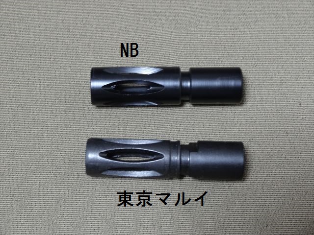 東京マルイの純正ハイダーと付属している専用スチールハイダーの比較です。一見マルイのハイダーでもつきそうですがラッチがかかるところまでサプレッサーが入りませんでした。