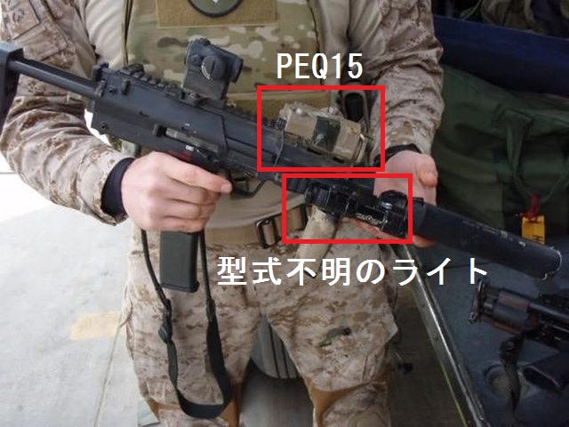 こちらの写真をみるとPEQ15 LEDライト&エイミングポインターと型式不明のライトの様なものが