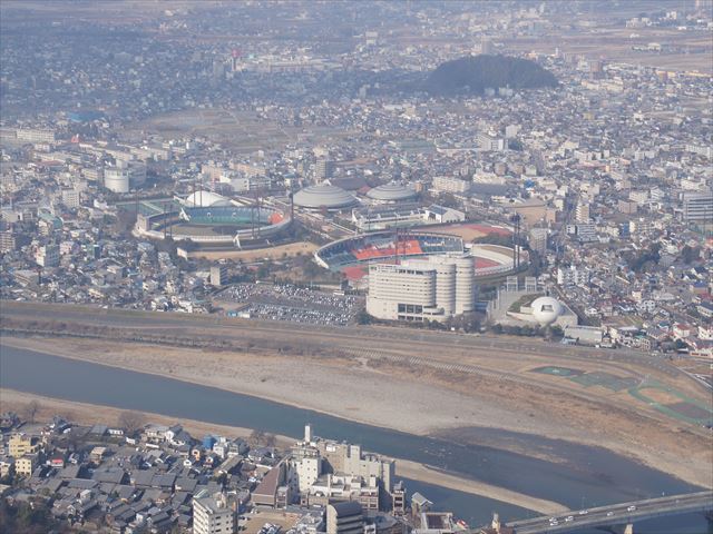 長良川の対岸に岐阜メモリアルセンターが見えています。その中でも左に長良川球場、右に長良川競技場が目立っています。