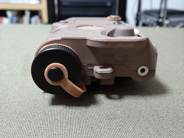 レーザーはスクリューで上下左右の調整が出来ますが、LEDライトの方のスクリューはダミーで光軸の調整は出来ません。真ん中にあるボタンスイッチでON/OFF出来ます。
