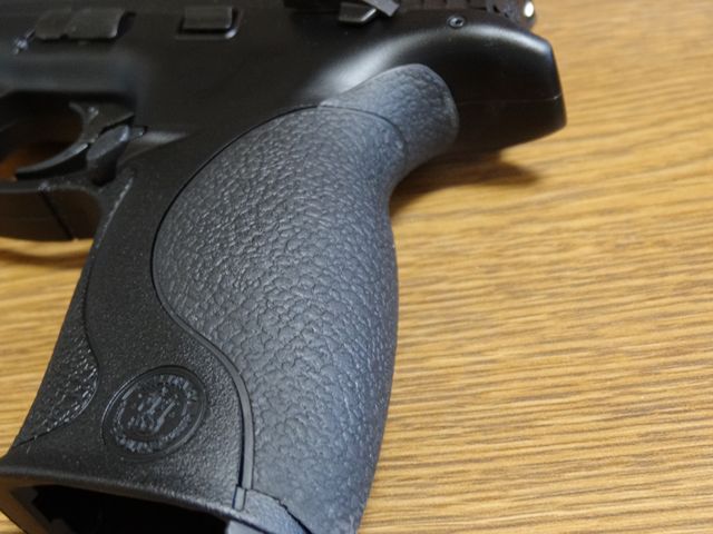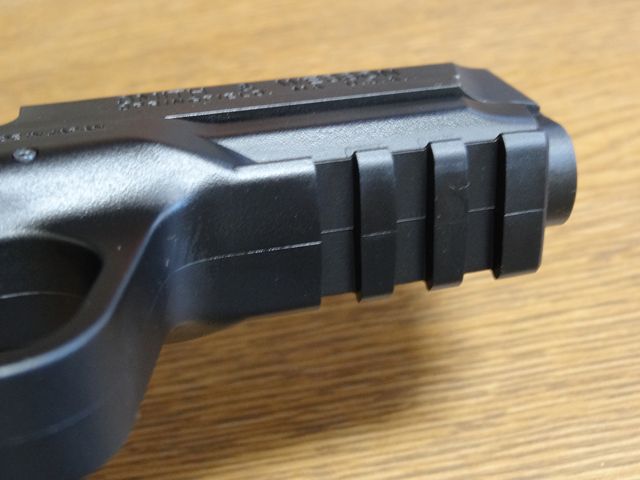 3スロットのアンダーレイルが装備されています。この部分はパーティングラインが目立ちますが実銃もこうなんでしょうか。