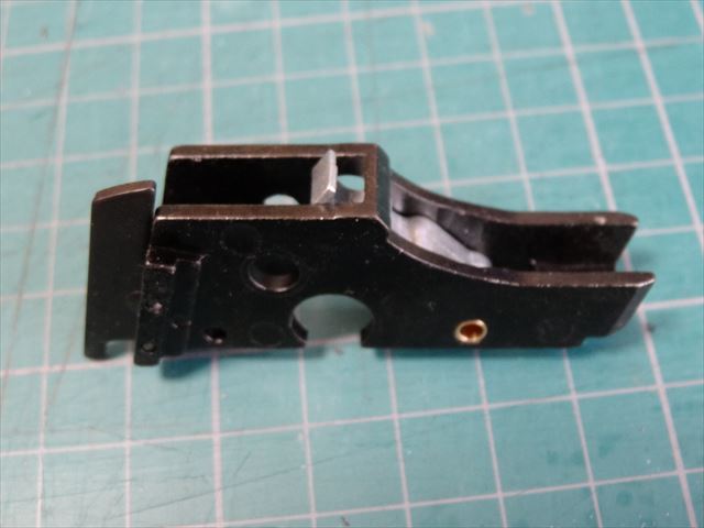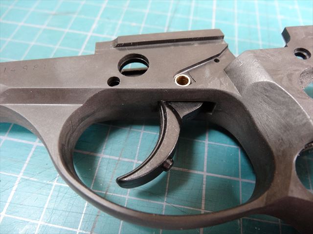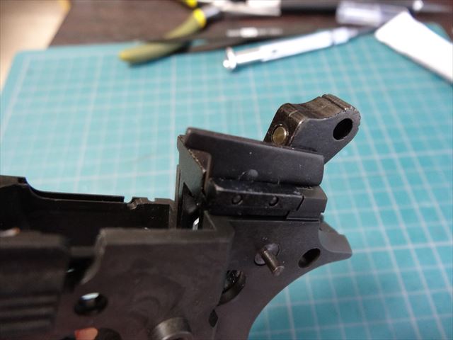 トリガーを取り付けます。以前は直接スライドキャッチのピンを差し込んでいましたが、新しいモデルはトリガーカラーというパイプ状の部品を挿入します。これによりやや組立て易く、スライドキャッチの動きがズムーズになるという利点がありそうです。