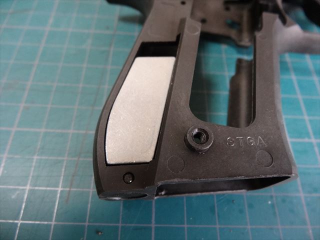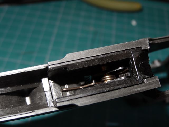 マガジンセフティスプリングを取り付けます。このスプリングはマガジンが入っていない時にトリガーバーを下方に引っ張り、トリガーを引いてもハンマーが落ちないようにするためのものです。マガジンを入れるとマガジンがこのスプリングを押し上げ、トリガーバースプリングの力でバーを上方に持ち上げハンマーが作動するようになります。