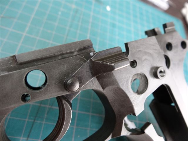 ハンマーハウジングをフレームに組み込みます。ハンマースプリングを押し込みながらハンマーピンを入れます。この作業は全体の作業の中でも1、2番に難しいところです。なんせハンマースプリングが固いので、それを押さえ込まないと孔位置が合わないんです。またピンを挿入するときはリコイルスプリングガイドを治具として使うようになっています。これは旧モデルにはありませんでした。