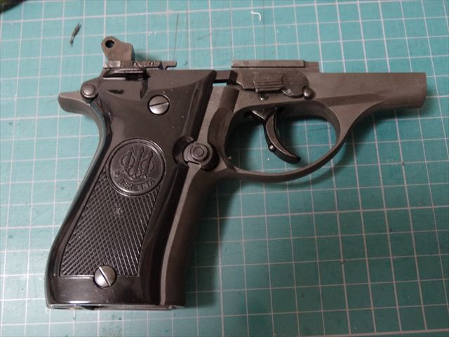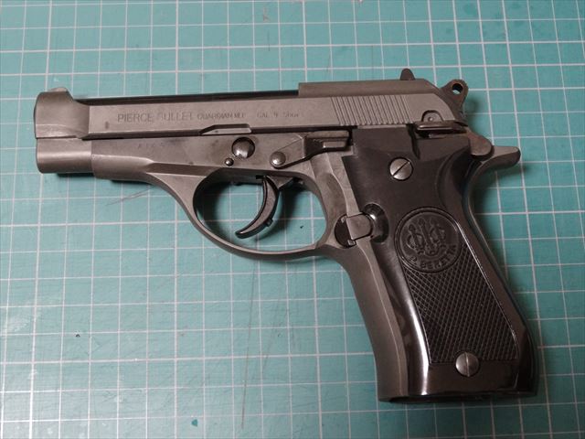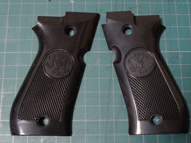参考までに、今回使用したグリップは以前のモデルについていた物で、ベレッタのマークが入っている物です。キットに付属のグリップは写真のようなM&Iのマークになっています。版権の関係でしょうが、スライドの刻印もおかしな物になっていますが、そこはガマンしましょう。