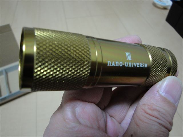 外観はゴールドでアルミ素材らしく、いい感じに出来ています。バッテリーは単4電池が3本です。